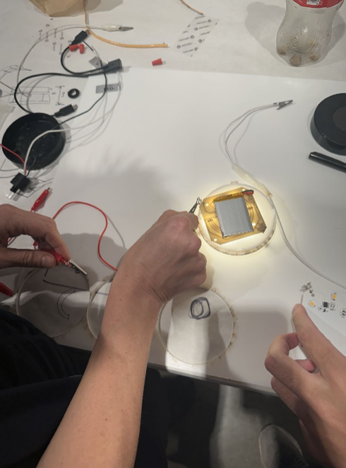 The table, plates, and lamp all interact with eachother. White reflective fishscales at the center of the table help bounce light onto menus and food, while the plates are interchangeable with the lamp top.